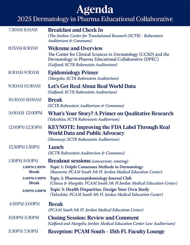 The Center for Clinical Sciences in Dermatology (CCSD) will host the second annual Dermatology in Pharma Educational Collaborative (DPEC) forum, on November 14, 2025. This is an exciting event that will bring together industry leaders, researchers, and clinicians to explore the latest advancements and challenges in dermatological research and pharmaceutical developments.